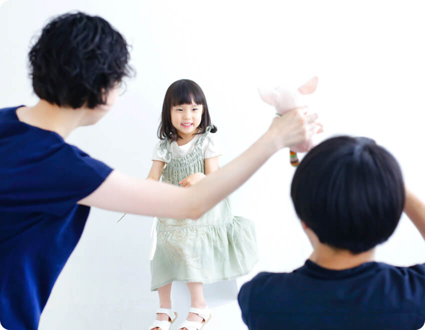 Point 01 子ども好きの専任スタッフ 「うちの子、落ち着きがなくて」というご心配は無用です。子どもの撮影に慣れた専任スタッフがお子様を担当し、くるくると動きまわる子どもらしい自然体の姿や表情をカメラにおさめます。
