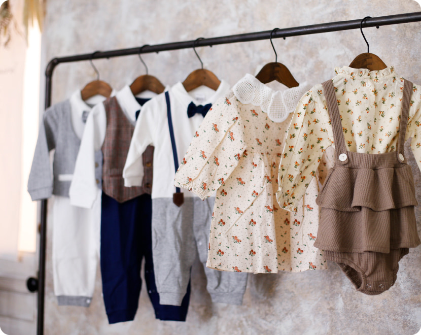 Point 01 衣装の無料レンタル ご予約時にお申し込みいただければ、無料で撮影用の衣装をお貸しいたします。ぜひお気軽にご相談ください。【衣装レンタル/70・80・90サイズ】 ※衣装レンタルをご利用の際は、予約時にお伝えください。