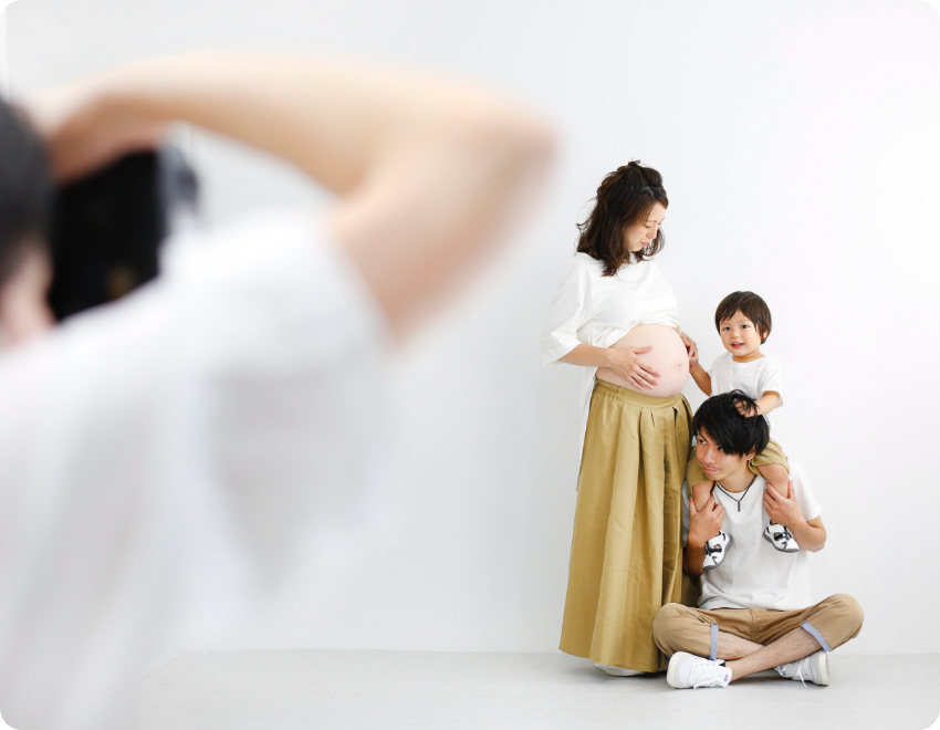 Point 04 人数・カット数制限なし 時間内であれば、人数やカット数の制限はありません。たとえば、お腹を出したお写真とマタニティドレス。ご夫婦のお写真、上のお子様との2ショットなど、様々な組み合わせで撮影いたします。またご一緒に撮影される方と事前に服装や小物についてご相談されると、より印象的な撮影体験になります。