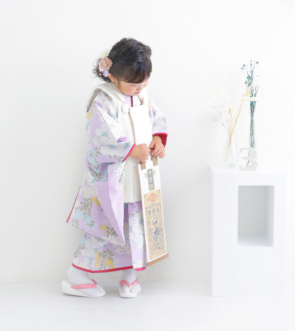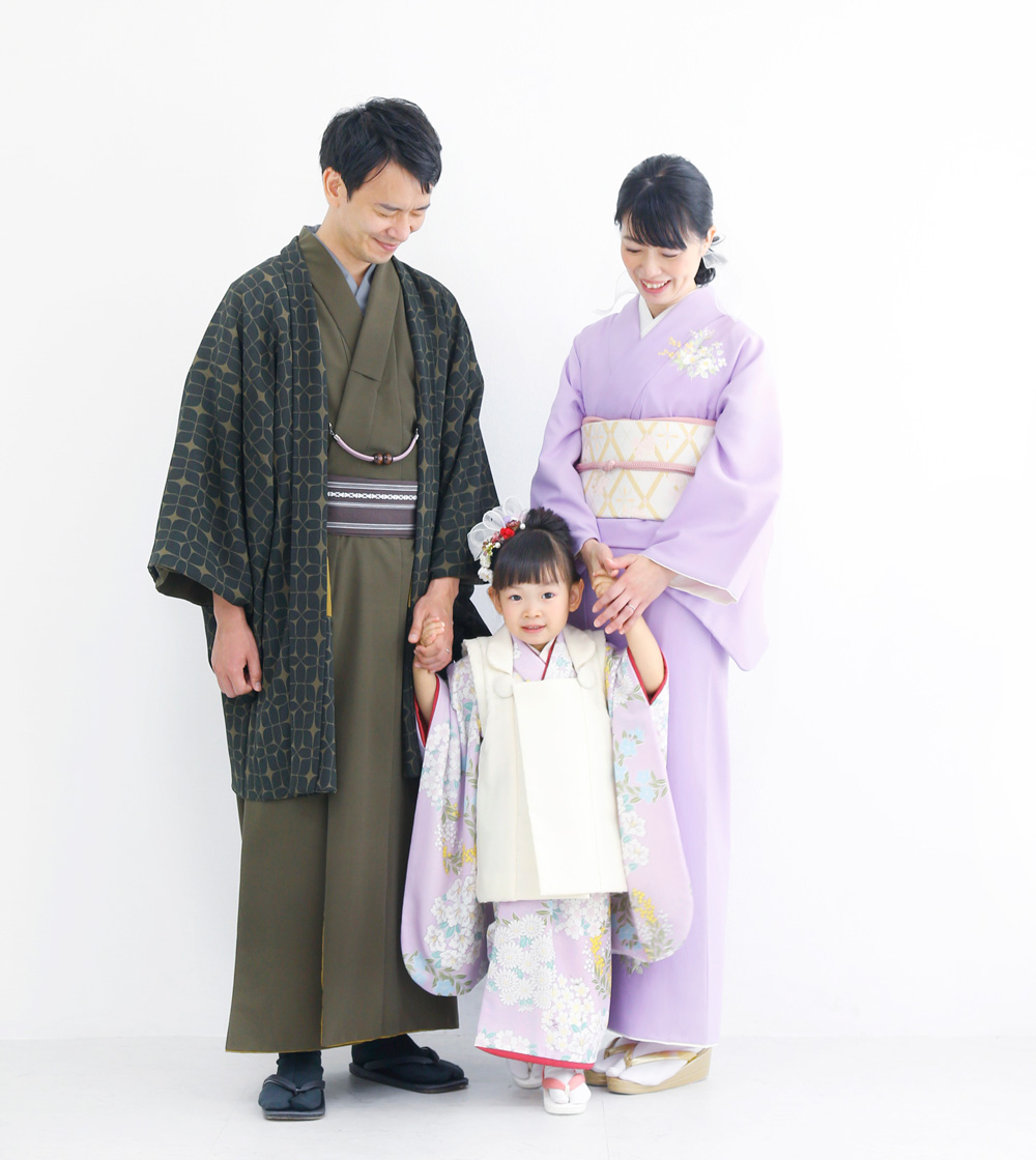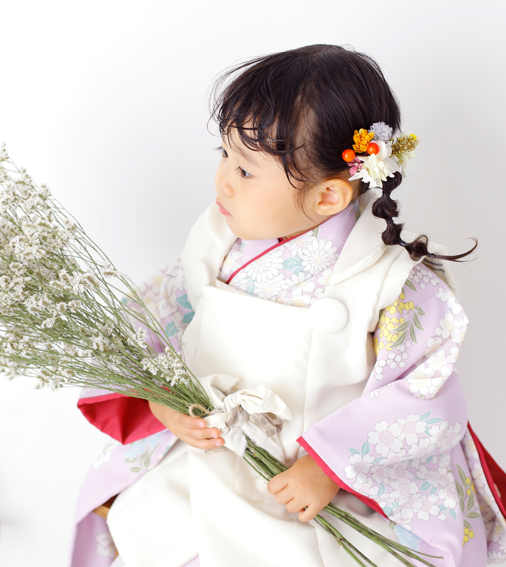 ナチュラルな色使いが人気のボタニカル柄に、透明感のあるラベンダーカラーが登場。「総柄」や「全くお揃い」にはちょっと抵抗が…というママにピッタリのリンクコーデの着物です。