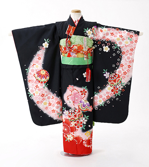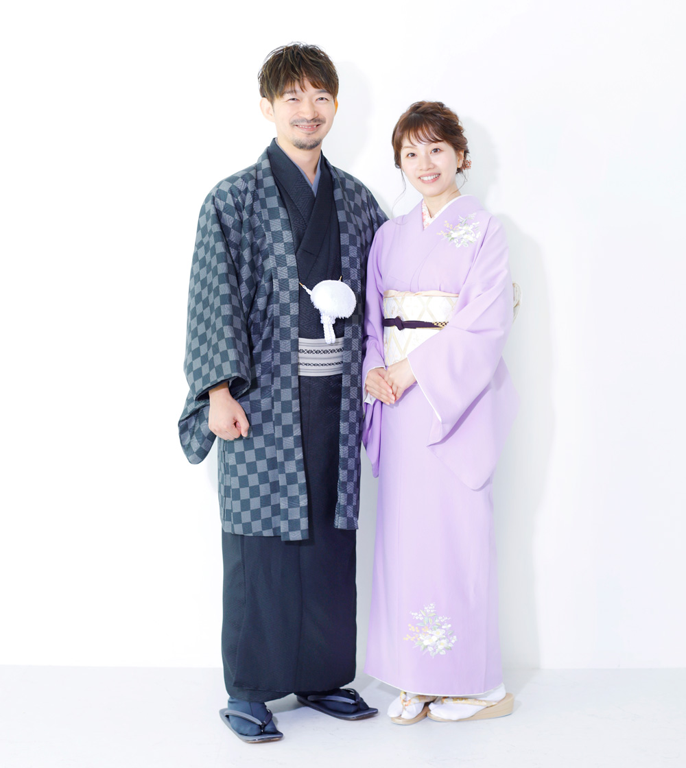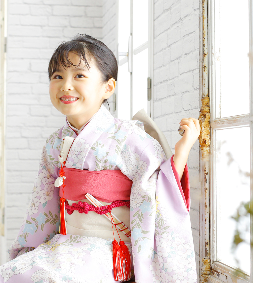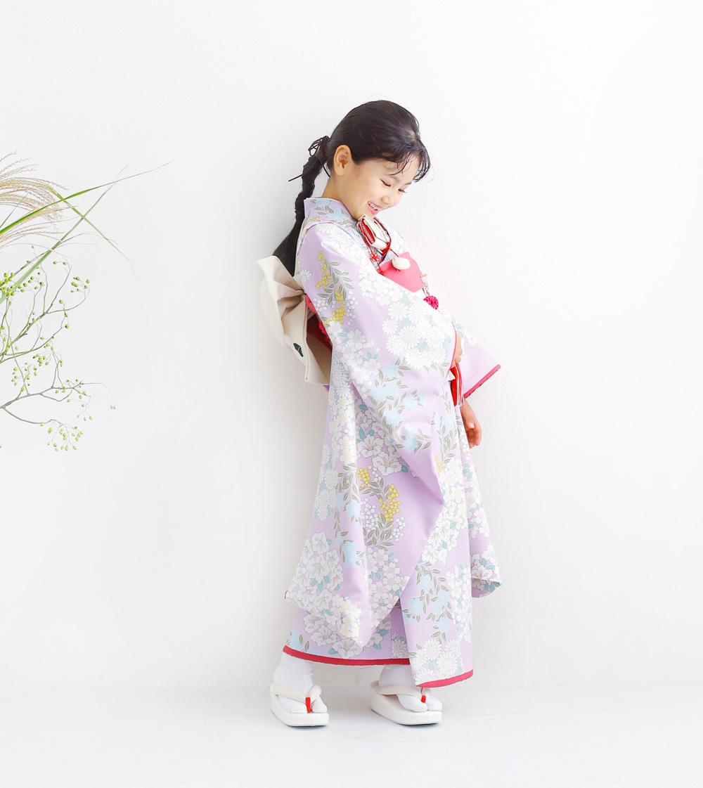 ナチュラルな色使いが人気のボタニカル柄に、透明感のあるラベンダーカラーが登場。「総柄」や「全くお揃い」にはちょっと抵抗が…というママにピッタリのリンクコーデの着物です。