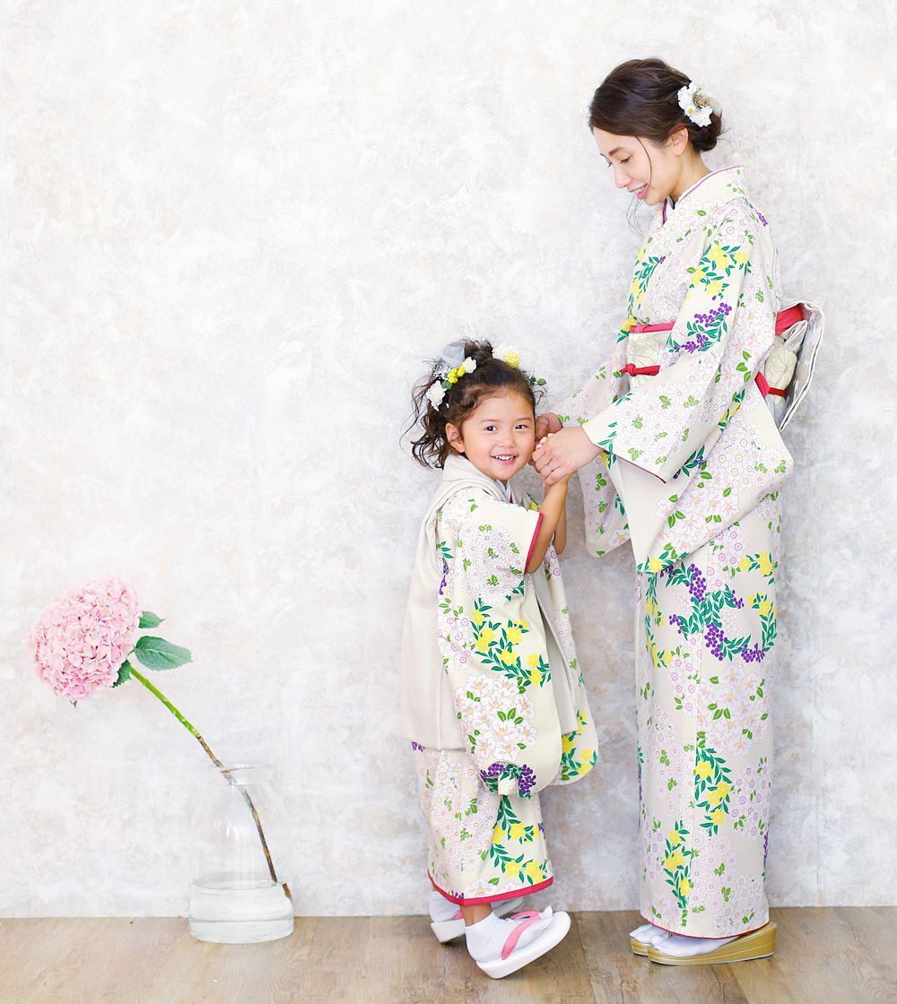 ナチュラルな色使いで、女の子を圧倒的キュートに魅せてくれるボタニカル柄の着物。