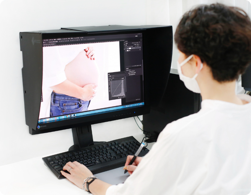 Point 03 妊娠線や肌荒れはキレイに補整 「妊娠線がある」「肌荒れがひどい」「下着のあとがある」など、お腹を出す撮影に抵抗がある方もご安心ください。撮影後にフォトレタッチ(美肌補整)のプロが自然な形でキレイに補整いたします。