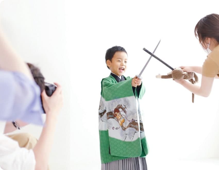 「着物着てくれるかな??」という不安がある場合は、事前にWebサイトの着物をお子様に見せて「今度これ着ようね!可愛いね、カッコいいね」と当日をイメージしやすいよう何度かお話をしておいていただけると、意外とあっさり着てくれることも。場所見知りについては、